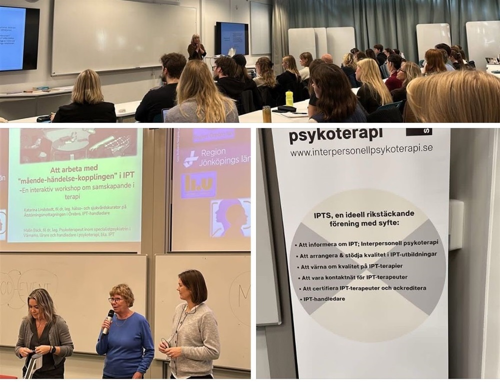 Svenska IPT-föreningen IPTS har i dagarna genomfört sin 17:e nationella konferens, denna gång på Linköpings Universitet. Torsdagen började med en introduktionsföreläsning om IPT, genomförd av Anna-Karin Åkerman. Salen var fullsmockad av blivande, nyblivna och erfarna IPT-terapeuter. Johanna Kullgard fördjupade sedan, efter att ordförande Karin Edholm hälsat alla välkomna, våra kunskaper kring att arbeta med respektive fokusområde. Dagen avslutades med att Katarina Lindstedt och Malin Bäck genomförde en workshop om att jobba med Mood- Event utifrån deras forskningsresultat baserat på en interaktions studie. Alla fick öva och i slutreflektionerna lyftes vikten av att få ett explicit samtycke om en gemensam förståelse för det gemensamma utforskandet kring det man pratar om, samt att terapeuten och patienten förstår något nytt tillsammans som ingen av dem förstod att de skulle finna viktigt innan sessionen börjar. Nästa dag berättade Niclas Kullgard om avhopp, i psykoterapi generellt och IPT i synnerhet. Malin Bäck berättade om resultaten från sin avhandling kring IPT vid ätstörningar med samtidigt depression och beskrev hur dessa resultat kan vara hjälpsamma även vid andra tillstånd när man jobbar med IPT. Avslutningsvis berättade Sanna Valijani Sjödin och Anna Falck om deras inspirerande gruppbehandling för deprimerade mammor inom mödra- och barnhälsovården i Umeå. Tack till alla som deltog och bidrog till en mycket givande konferens - såväl föreläsare som åhörare!